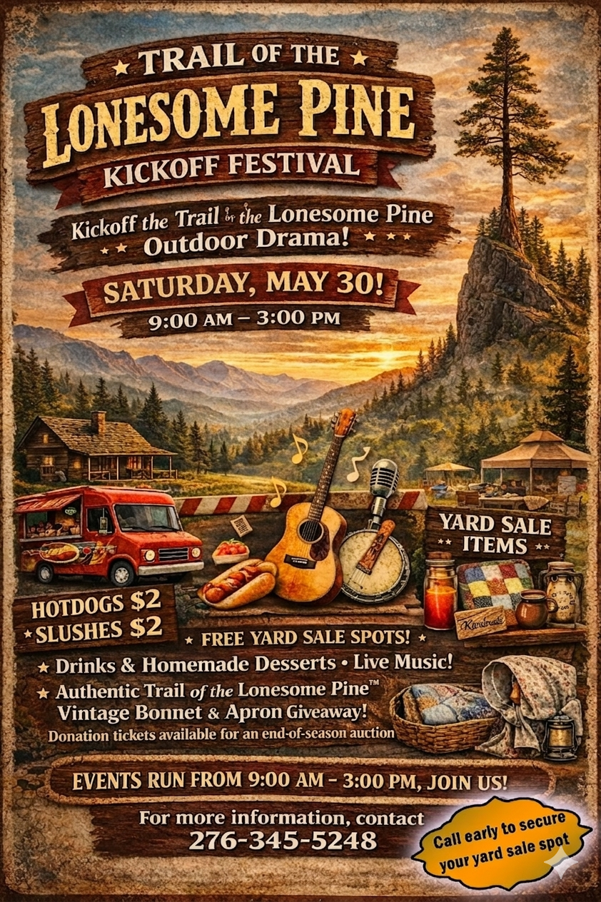 Situated in Big Stone Gap, Virginia, the Trail of the Lonesome Pine Outdoor Drama is based on the best-selling novel of the same name, written by local author John Fox, Jr. It tells the story of how coal brought new life to the Appalachian region over a century ago. At the heart of the story, burns the feud between the Tollivers and the Falins, two rival factions who are sworn enemies from decades past. With music, dance, and passionate performances, “The Trail” is known far and wide for its heart-felt romance between a young mountain girl and an engineer who comes to the region in search of coal. The Drama will return in 2026 for its 63rd Annual Season.